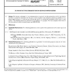 The design and location of rear-viewing mirrors or systems, and the presentation of the rear view to the driver can best be achieved if the designer and the engineer have adequate references available on the physiological functions of head and eye movements and on the perceptual capabilities of the human visual system. The following information and charts are provided for this purpose. For more complete information of the relationship of vision to forward vision, see SAE SP-279.