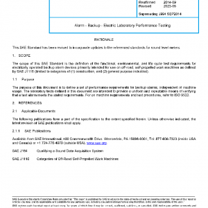 The scope of this SAE Standard is the definition of the functional, environmental, and life cycle test requirements for electrically operated backup alarm devices primarily intended for use on off-road, self-propelled work machines as defined by SAE J1116 (limited to categories of (1) construction, and (2) general purpose industrial).