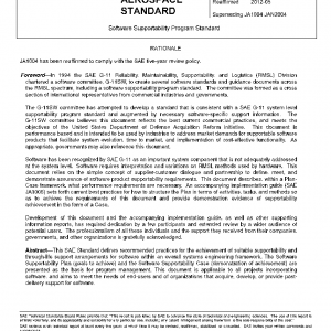 This SAE Standard defines the basic structural elements, and guidance on compilation and management, for a software supportability program. Software supportability considerations include initial design influence and through-life support embracing the operational use, post-delivery modification, and logistics management of software. This document requires that the processes of design, development, selection, and production of software include software supportability considerations, as relevant to particular project needs.