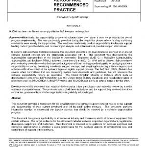This SAE Recommended Practice provides a framework for the establishment of a software support concept related to the support and supportability of both custom-developed and Off-the-Shelf (OTS) software.