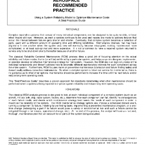 SAE JA6097 (“Using a System Reliability Model to Optimize Maintenance”) shows how to determine which maintenance to perform on a system when that system requires corrective maintenance to achieve the lowest long-term operating cost. While this document may focus on applications to Jet Engines and Aircraft, this methodology could be applied to nearly any type of system. However, it would be most effective for systems that are tightly integrated, where a failure in any part of the system causes the entire system to go off-line, and the process of accessing a failed component can require additional maintenance on other unrelated components.