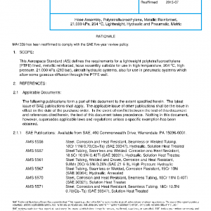 This Aerospace Standard (AS) defines the requirements for a lightweight polytetrafluoroethylene (PTFE) lined, metallic reinforced, hose assembly suitable for use in high temperature, 204 °C, high pressure, 21,000 kPa (210 bar), aircraft hydraulic systems, also for use in pneumatic systems which allow some gaseous diffusion through the PTFE wall.