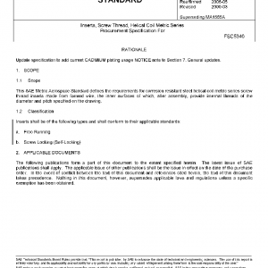 This SAE Metric Aerospace Standard defines the requirements for corrosion resistant steel helical coil metric series screw thread inserts made from formed wire, the inner surfaces of which, after assembly, provide internal threads of the diameter and pitch specified on the drawing.