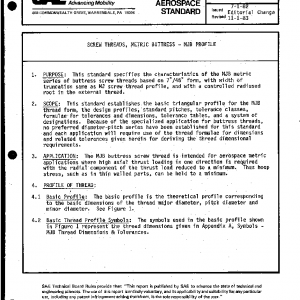 This standard establishes the basic triangular profile for the MJB thread form, the design profiles, standard pitches, tolerance classes, formulae for tolerances and dimensions, tolerance tables, and a system of designations. Because of the specialized application for buttress threads, no preferred diameter-pitch series have been established for this standard and each application will require use of the thread formulae for dimensions and related tolerances given herein for deriving the thread dimensional requirements.