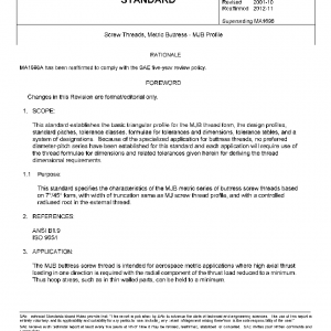 This standard establishes the basic triangular profile for the MJB thread form, the design profiles, standard pitches, tolerance classes, formulae for tolerances and dimensions, tolerance tables, and a system of designations. Because of the specialized application for buttress threads, no preferred diameter-pitch series have been established for this standard and each application will require use of the thread formulae for dimensions and related tolerances given herein for deriving the thread dimensional requirements.