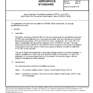This Metric Aerospace Standard (MA) covers the requirements for polytetrafluoroethylene (PTFE) hose assemblies for use in aerospace hydraulic, fuel, and lubricating oil systems at temperatures between -55°C and 232°C for Class I assemblies, -55°C and 135°C for Class II assemblies, and at nominal pressures up to 10 500 kPa (105 bar). The hose assemblies are also suitable for use within the same temperature and pressure limitations in aerospace pneumatic systems where some gaseous diffusion through the wall of the PTFE liner can be tolerated.