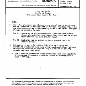 This procurement specification covers aircraft quality metric studs made of a corrosion and heat resistant age hardenable iron base alloy of the type identified under the Unified Numbering System as UNS S66286. Two types of studs are covered as follows: