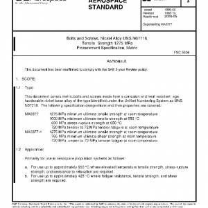 This document covers metric bolts and screws made from a corrosion and heat resistant, age hardenable nickel base alloy of the type identified under the Unified Numbering System as UNS N07718. The following specification designations and their properties are covered: