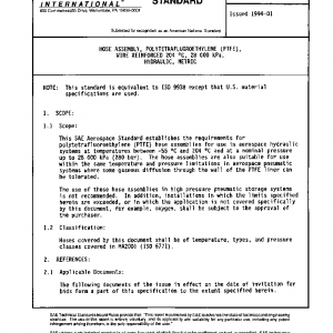 This SAE Aerospace Standard establishes the requirements for polytetrafluoroethylene (PTFE) hose assemblies for use in aerospace hydraulic systems at temperatures between -55 °C and 204 °C and at a nominal pressure up to 28 000 kPa (280 bar). The hose assemblies are also suitable for use within the same temperature and pressure limitations in aerospace pneumatic systems where some gaseous diffusion through the wall of the PTFE liner can be tolerated.