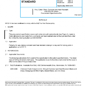 This procurement specification covers split cotter pins with optional ends (see Figure 1), made to metric dimensions and made from a corrosion and heat resistant steel of the type identified under the Unified Numbering System as UNS S32100.