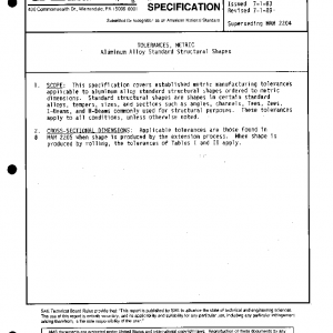 This specification covers established metric manufacturing tolerances applicable to aluminum alloy standard structural shapes ordered to metric dimensions. Standard structural shapes are shapes in certain standard alloys, tempers, sizes, and sections such as angles, channels, Tees, Zees, I-Beams, and H-Beams commonly used for structural purposes. These tolerances apply to all conditions, unless otherwise noted.