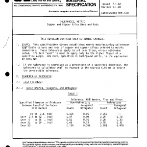 This specification covers established metric manufacturing tolerances applicable to bars and rods of copper and copper alloys ordered to metric dimensions. These tolerances apply to all conditions, unless otherwise noted. The term “excl” is used to apply only to the higher figure of a specified range. AMS 2221, specified in inch/pound units, is the equivalent of this MAM.