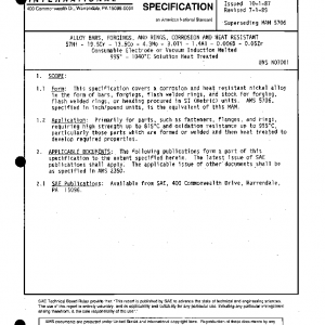 ALLOY BARS, FORGINGS, AND RINGS, CORROSION AND HEAT RESISTANT 57Ni – 19.5Cr – 13.5Co – 4.3Mo – 3.0Ti – 1.4Al – 0.006B – 0.05Zr Consumable Electrode or Vacuum Induction Melted 995° – 1040°C Solution Heat Treated