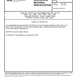 This specification covers a corrosion and heat resistant nickel alloy in the form of sheet, strip, and foil up to 0.38 millimeters in nominal thickness procured in SI (Metric) units.AMS 5914 is the inch/pound version of this MAM.These products have been used typically for the fabrication of bellows, diaphragms, and other components requiring a combination of high strength, resistance to heat and corrosion, leak tightness, and maximum fatigue life, but usage is not limited to such applications.