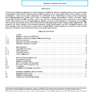 This document provides reference information and guidance concerning methods used by the semiconductor industry and original equipment manufacturers related to radiation hardness assessments. This document is broken into three primary sections. Section 3 discusses part characterization with focus on selection criteria and acceptance testing. Section 4 discusses design hardening for piece parts with focus on degraded design limits and radiation design margin. The last section, Section 5, of this report is on hardness assurance inspection and test. This section discusses total ionizing dose, displacement damage and single event effects testing in detail.