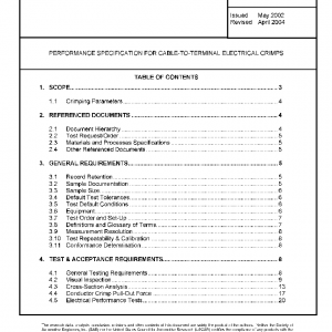 This specification defines basic test methods and requirements for solder-less crimped connections. Some sections of this document may also be applicable to other terminal attachment methods such as sonic or electrical welding or soldering. In these cases, applicability of the procedures in this document shall be determined by the Responsible Engineer.
