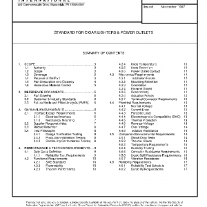 This standard is intended to cover cigar or cigarette lighters as well as power outlets based on the form and dimensions of the cigar lighter. This standard is a full performance specification, it includes dimensional and operational parameters as well as performance characteristics which must be met when submitting a cigar lighter assembly or power outlet assembly for production approval. This standard constitutes an acceptance specification for a surface mounted, front-loaded cigar lighter or power outlet.