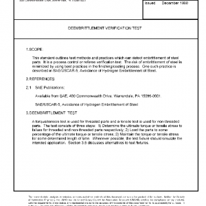 This standard outlines test methods and practices which can detect embrittlement of steel parts. It is a process control or referee verification test. The risk of embrittlement of steel is minimized by using best practices in the finishing/coating process. One such practice is described in SAE/USCAR-5, Avoidance of Hydrogen Embrittlement of Steel.